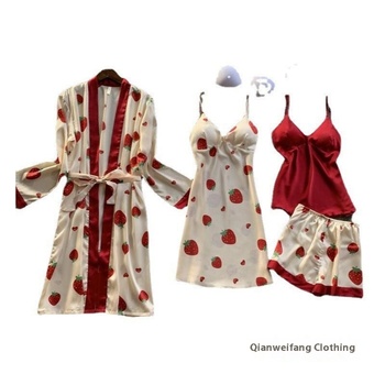 महिलाओं का वसंत शरद ऋतु चार-टुकड़ा सेट क्रॉस-बॉर्डर हॉट-सेलिंग पोका डॉट छाती पैड इलास्टिक कमर स्ट्रॉबेरी सेक्सी स्ट्रैप नाइट ड्रेस